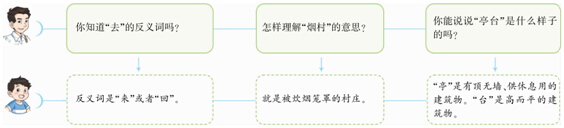 1.让孩子做动作理解“去”的意思,从而轻松找到反义词。2.利用图片,让孩子找找哪幅图符合“烟村”的意思。3.可以让孩子说说在公园里看见的“亭台”是什么样子的,然后搜集一些图片,帮助孩子理解词语的意思。