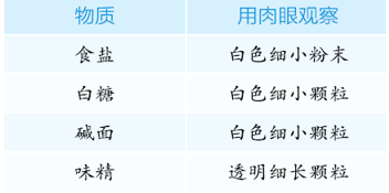 P7我们在放大镜下观察到的食盐、白糖、碱面、味精的颗粒分别是怎样的?同种物质的颗粒形状都大致一样吗?