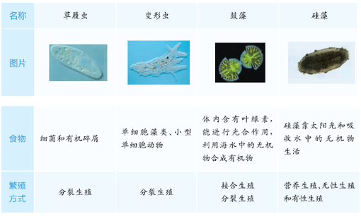 我们在水中发现了变形虫、鼓藻、草履虫、船形硅藻。
