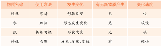 我们用手弯折使铁丝的形状发生改变;折纸使纸的形状发生改变;加热使水蒸发,改变水的存在状态;点燃蜡烛,使其燃烧,蜡烛本身发生着改变,产生了新的物质。