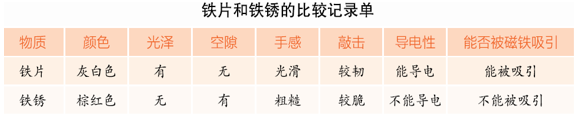 铁片和铁锈从颜色、光泽、空隙、手感、韧性、导电性、能否被磁铁吸引等很多方面有很多的不同点。铁生锈变成了铁锈是一种化学变化。我们可以通过对比实验来验证自己的观点。