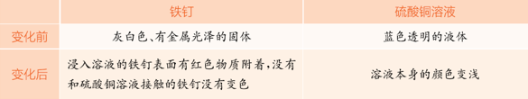 我们的证据:与硫酸铜溶液接触的铁钉表面会出现红色物质,而没有浸入硫酸铜溶液的铁钉没有附着红色物质,这说明这种红色物质是从硫酸铜溶液中析出来的。溶液颜色变浅,说明溶液不是硫酸铜溶液了,或者说硫酸铜的含量已经减少,有另外的物质生成了。
