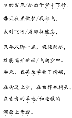 解析 本文记叙了童年的发现,反映了儿童求知若渴的特点和惊人的想象力。朗读时,要深入体会作者的探究精神及情感变化。关于描述梦的一段,要通过“只要……就……”“甚至”“那样”“似乎”等词语,读出梦的神奇和梦中飞行的美妙;关于请教老师的部分,要读出好奇的心理和迫切探究的心情;课文的结束句一语双关,要读出自嘲和愤慨的语气。