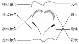 解析:昆虫的头部都有一对触角,昆虫的触角像“天线”,能感触物体,嗅到气味,还能平衡身体。不同各类的“天线”的形态也各不相同:蟋蟀、蝗虫的触角是丝状;蚂蚁的触角是膝状;蝴蝶的触角是棒状;雄蛾的触角是羽状;天牛的触角是鞭状。