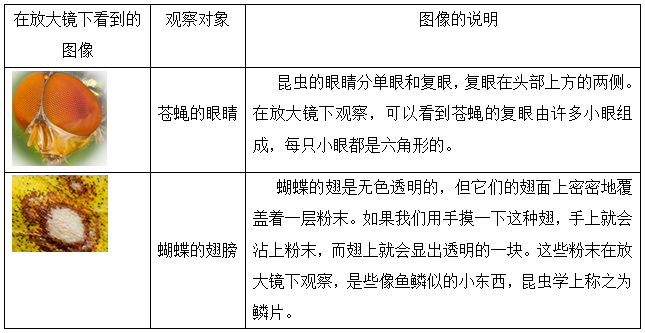 (2)√ 解析:使用放大镜观察昆虫,我们可以得到更多的信息。比如用放大镜可以看到用肉眼无法观察到的苍蝇的复眼、蚜虫的身体特征等信息。