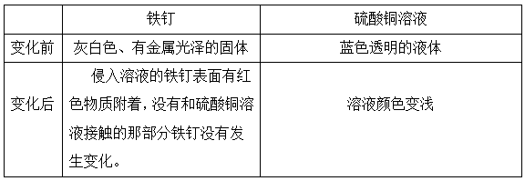 (2)灰白 蓝 解析:崭新的铁钉是灰白色的,硫酸铜溶液是蓝色透明的液体。