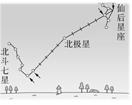 (5)北极星 北斗七星 小熊 解析:北极星指的是最靠近北天极的一颗星,所以北极星不是一成不变的,现阶段所指的是小熊座α星。它的亮度并不高,它的位置与北斗七星的相对位置保持不变,因此可以先找到北斗七星后,再确定北极星的位置。