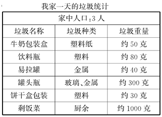 (2)①按材料分:塑料:牛奶包装盒、饮料瓶、饼干盒包装;金属:易拉罐、罐头瓶;玻璃:罐头瓶;厨余:剩饭菜。