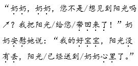 解析 这篇文章主要写了苗苗给奶奶送阳光的事,故事中有两个人物,读的时候要注意用不同的语气。第1自然段奶奶说的话,要带着渴望的语气来读,最后一个自然段奶奶说的话,要读出安慰和欣慰的语气。读苗苗说的话时,语调稍高、语速稍快,读出苗苗的急切心理。