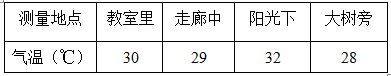 阳光下的温度最高、教室里和走廊中的温度次之,大树旁温度最低。教室外阴凉、通风处的温度可以反映当地的气温。