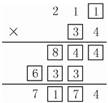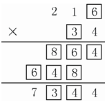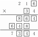分析:根据积的个位上是4,第二个乘数个位上也是4,可以判断出第一个乘数个位上可能是1或6。根据积的最高位上是7,第一个乘数最高位上是2,2×3<7,可以判断出第二个乘数最高位上只能是3,这时可以采用假设法进行尝试: