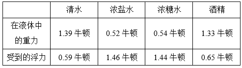 解析:本题考查液体提供的浮力的影响因素。首先是排开的水量的多少,另外还有液体本身的性质也影响它能提供的浮力。