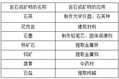 我们生活和生产中有很多物品都是由岩石和矿物制成的,如果离开岩石和矿物,我们将寸步难行。 解析:我们的衣食住行会用到很多种矿物制成的物品。