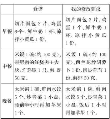 解析:对照膳食宝塔,对食谱进行调整。要注意控制油脂类食品的过多摄入。