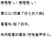 解析 本文语言生动、形象、精练,很适合朗读。第1自然段要读出春雨柔和、轻声呼唤的语气,感受“润物细无声”的意境美;第2自然段要读出柔弱、撒娇的语气;读第3自然段时声音稍大、急促、粗重,要读出个性;最后两个自然段要读得响亮、自豪,表现笋芽儿长成竹子的欣(xīn)喜。