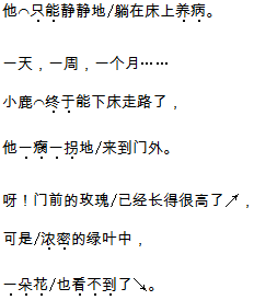 解析 故事中有四个角色。小鹿从栽玫瑰的用心,到数枝头花骨朵儿的高兴,到不小心跌伤脚后的无奈与焦急,再到一朵玫瑰花也没看到后的失望,最后到听到黄莺和微风的话后的高兴与欣慰,这一系列的情感变化,要用心体会并把它表现出来。鹿弟弟的话第一次要用惋惜的语气来读,当看到哥哥高兴地笑了,他也感到花儿给大家带来了快乐,因此他也很高兴,这时要用高兴与欣慰的语气来读。黄莺与微风的话要读出赞美的语气,因为他们欣赏到了玫瑰花,很快乐。