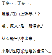 解析 这首儿歌写的是泉水流进海洋的过程:泉水―→小溪―→江河―→海洋。同学们要在读准字音,读通句子的基础上,做到有感情地朗读。读问句时,要用惊奇、上扬的语调;读答句时,要用欢快、自豪的语气。然后小组合作进行朗读表演,如果能背下来就更好了。