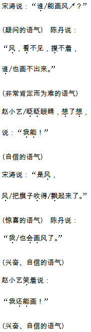 解析 分角色朗读前,首先要弄清每个人物的态度、观点、做法:宋涛是一个敢于想象、善于提出问题的男孩;陈丹敢于修正自己的错误,并善于向别人学习;而赵小艺敢于迎接挑战,善于思考问题、解决问题。然后我们再弄清他们分别是怎样画风的,在此基础上练习朗读。