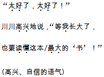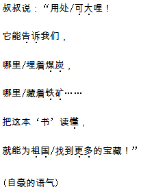 解析 本文主要是以川川与地质勘探队员对话的形式呈现出来的,因此读好本课的关键是要读好他们的对话。同学们在读他们的对话时,首先要弄清人物的身份。川川是一名学生,说起话来要天真些,语速稍快。而地质勘探队员叔叔是一个大人,是一位向川川讲述地质知识的长者,说话时语速要稍慢些。其次要根据揭示他们动作、心情的提示语或说话的内容揣(chuǎi)摩他们说话时的心情。最后要联系上下文弄清楚每句话是谁说的。这样弄清楚以后,再分角色朗读,自然水到渠成。