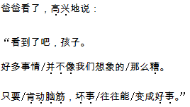 解析 这是让我们根据本课的内容,结合爸爸说的话,说一说生活中坏事经过动脑后变成好事的例子。我们要结合生活实际,认真回想自己经历过的类似的事。