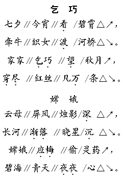 解析 《乞巧》是唐代诗人林杰描写民间七夕乞巧盛况的名诗。朗读时,语气是喜悦的,语调是轻快上扬的。《嫦娥》通过描写嫦娥夜夜孤寂悲凉的生活,表达作者凄凉孤独的心境。朗读时,语气深沉冷寂,语调低缓,注意古诗的停顿和节奏。