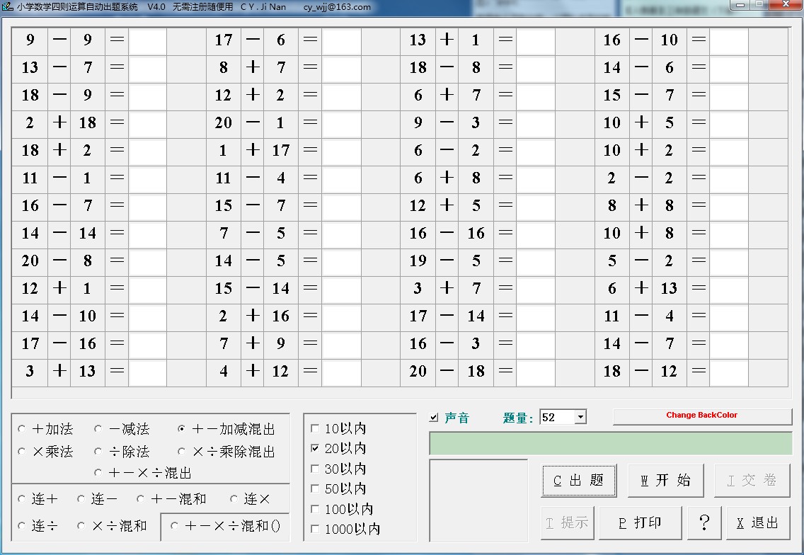 每点出题按钮都随机出一套不同的题目,有多种选择:加减乘除、连加、连减、连乘、连除、带括号加减乘除混合运算...... 还可以选择题量和多大数值范围(比如默认20以内),答题完后点击交卷按钮,程序自动计时并判断对错,根据错题数量显示小花,如果出错太多会出一个大猪头,配以鼓掌等声音效果,提高孩子的做题兴趣。另外程序提供打印功能,一张A4纸纵向可以打印两套题。