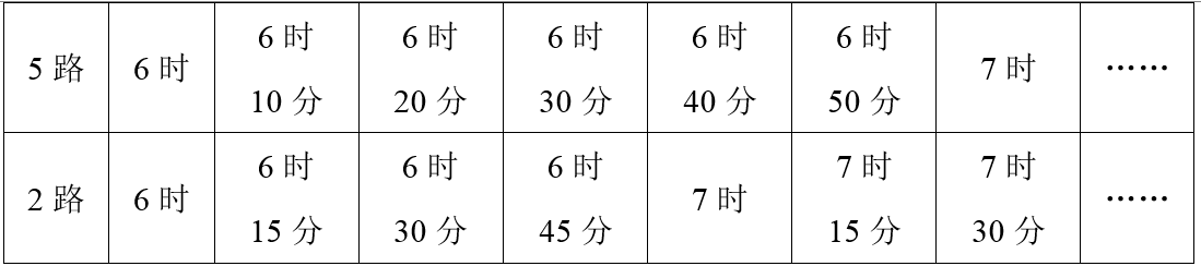 从早上6时同时发车后,7时5路和2路公共汽车第三次同时发车。