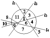 分析:画3条直线分圆时,先画第一条直线和第二条直线相交,且交点在圆内。再画第三条直线与前两条直线相交,且交点在圆内,但注意第三条直线不要经过前两条直线的交点。这样画分得最多,可以分成7部分。(如下图)画4条直线分圆时,可在3条直线分圆的基础上,画第四条直线与前三条直线相交,交点在圆内,且交点不经过之前的任意交点。这样画分得最多,可以分成11部分。(如下图)