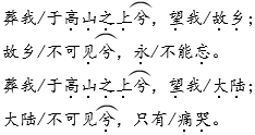 解析 这首诗情感强烈,读来令人震撼。通篇的朗读基调是深情、渴望的,是痛苦、怅惘的。语调回环激荡,语速较缓慢。第1、2小节,读出思念故乡、心系大陆的强烈思想感情。