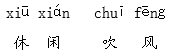 〔休闲〕休息;过清闲生活。例句:英雄广场已成为人们茶余饭后休闲娱乐的场所。〔吹风〕被风吹,身体受风寒。例句:妈妈告诉我出了汗别吹风。〔胡须〕胡子。例句:关公的胡须很美。