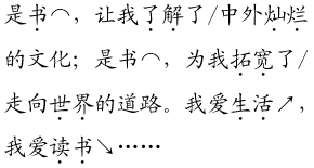 解析 这首诗篇幅短小,语言清新,蕴涵着丰富的情感。朗读时,要注意诗的节奏和诗中的停顿,着重处理好诗句的韵脚和情感的起伏变化。第1、2小节语速先慢后快,随着介绍的展开,语气也要逐渐热烈起来,要读出内心的喜悦与自豪感。然后语速转为平缓,以庄重的口吻读出“我”从书中得到的教益与收获。最后,带着感激的心情读出对小书橱的喜爱及对书的敬重之情,表达内心的热爱与向往。