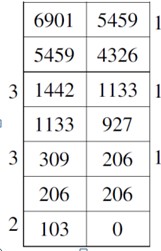 5459和6901的最大公因数是103。辗转相除法又名欧几里得算法,是求两个正整数之最大公因子的算法。它是已知最古老的算法,可追溯至3000年前。它首次出现于欧几里得的《几何原本》中,而在中国则可以追溯至东汉出现的《九章算术》。方法是:先用较小的一个数除较大的一个数,得第一个余数;再用第一个余数除较小的数,得第二个余数;又用第二个余数除第一个余数,得第三个余数;这样继续用后一个余数除前一个余数,直到余数为0,最后一个除数就是所求的最大公因数。