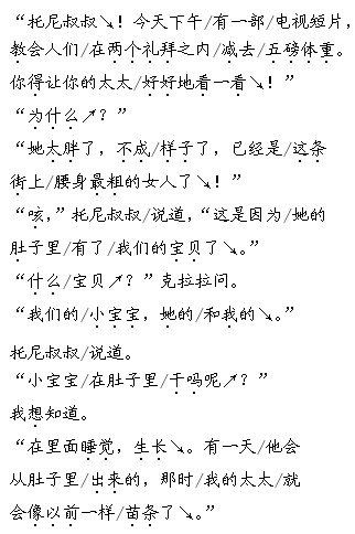 答案 等啊,等啊,托尼叔叔的小宝贝终于出来了,他的妻子也变得和以前一样苗条了。但是,“我”和克拉拉都感到非常奇怪,为什么所有的人都没有大吃一惊呢?这个秘密只有我们知道呀?于是,“我”和克拉拉就去问爸爸和妈妈,为什么他们没有大吃一惊。妈妈笑着说:“孩子,我们知道托尼叔叔的妻子变胖是因为有小宝贝了呀!”哦,我的天,原来大人们都知道啊!