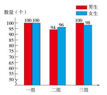 分析:根据题意及已给的复式条形统计图可解此题,即二组女生收集饮料瓶的数量是98×3-100-98=96(个),三组男生收集饮料瓶的数量是98×3-100-94=100(个)。