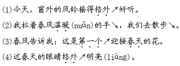 解析 这道题提供的4个句子,写得优美顺畅,展现了春天的特点。朗读时,要读出轻快、温柔的语气。读第(1)句时,要读出看到春天到来时的喜悦之情。“格外”一词要重读。读第(2)句中的“我们去散步”时,语调应轻柔。第(3)句中应读好春风说的话,语气中需要略带骄傲,“第一个”“春天”要重读。第(4)句中的“眼睛”指的是白桦树在春天里发出的新芽,所以要读出春天的勃勃生机,语调中应充满活力与快乐。