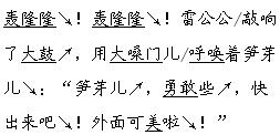 解析 本文语言生动、形象、精练,很适合朗读。第1自然段要读出春雨柔和、轻声呼唤的语气,感受“润物细无声”的意境美。笋芽儿的话要读出不同时候的不同心理:先是害怕,要读出想出去又不敢出去的心理,“妈妈,我想到外面去”读得慢些,读出犹豫的语气。然后是“痒痒”,读得坚定些,“妈妈,我不怕,我要出去”,把重音放在“要”上。后来遇到了困难,要读出笋芽儿灰心丧气的语气。最后一个自然段,要读得响亮、明快。读雷公公的话声音稍大、急促、粗重,读出个性。