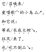 解析 这首儿歌,语言亲切,富有童趣,读起来朗朗上口。朗读整篇课文,语速宜缓,要带着高兴的心情,读出对小树的喜爱之情。读第一小节时,要表达出春天到了,小树变绿的高兴心情。“摇、绿”要读得重些,突出小树的特点。读第二小节时,要表达出小树开花了的喜悦心情。“摇、红”宜重读。第三小节是小树对小鸟说的话,读这一小节时要用自豪的语气。
