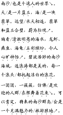 解析 先在中国地图上找到南沙群岛,再结合课文内容向同学或家人介绍。可以介绍南沙的景色、物产、历史、地理位置等,也可以选自己感兴趣的一个方面来介绍。介绍时,可以用文中的语言,也可以用自己的语言作创造性的表述。