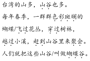 解析 本文语言优美,富有韵律,朗读时,要在感知、感悟台湾蝴蝶谷的美景的基础上,读出美感,让听者感受到每年春季蝴蝶飞来的生动场面和蝴蝶谷的迷人景象。