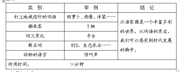 解析 这个表格所列举的五个类别,正对应着课文的第二至六自然段,在相应的段落中找出例子填写,例子多的只选择其中某些填写即可。所得的结论应在第一自然段中找,如“汉语家园是一个丰富多彩的世界”等。