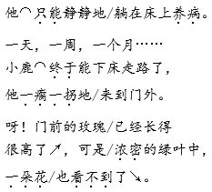 答案 ①小鹿和弟弟一起数玫瑰花骨朵儿时,可以一边数,一边说:“一个、两个……呀!(双手摊开)这么多,有三十二个!”然后他们跳起来。②小鹿病好后,一瘸一拐地来到门外,失望地说(摇头,失望的表情):“呀!玫瑰已经长得这么高了,可我一朵花也没看到。”
