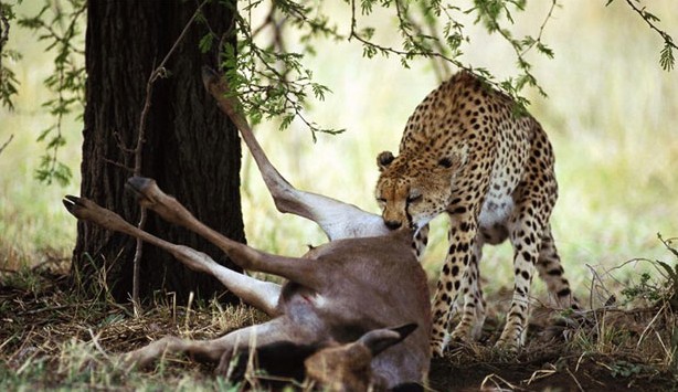 当金钱豹捕到一头大型猎物,又一顿吃不完时,为了防止其他动物偷吃,它就把吃剩的猎物拖到树上藏起来。金钱豹就像一台有生命的“起重机”,一只60千克的豹,竟能把90千克重的猎物拖上树。