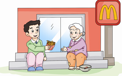 2012年5月的一天,南京一家麦当劳门口,一位美国青年看见一位乞讨的老奶奶光着脚坐在门前的台阶上。