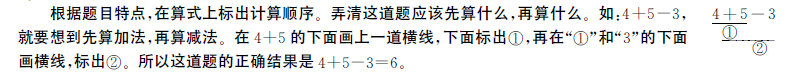 根据题目特点,在算式上标出计算顺序。弄清这道题应该先算什么,再算什么。如:4+5-3,就要想到先算加法,再算减法。在4+5的下面画上一道横线,下面标出①,再在“①”和“3”的下面画横线,标出②。所以这道题的正确结果是4+5-3=6。