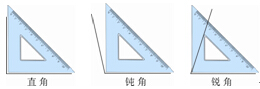 (4)看三角尺上另一条直角边的位置。如果与已知角的另一条边重合,那么这个角就是直角;如果在已知角另一条边的内侧,则这个角是钝角;如果在已知角另一条边的外侧,则这个角是锐角。