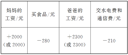 分析:本题考查了负数的意义及负数在生活中的合理应用,即收入为正,支出为负。题目中,爸爸、妈妈的工资为收入部分,表示为正数,分别为+2300(或省略“+”为2300)和+2000(或省略“+”为2000)。而买食品,交电费和通信费为花出去的钱,即支出部分,表示为负数,分别为-280和-210。(注意:“-”不可省略)