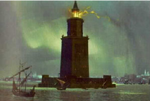 遵照亚历山大大帝(马其顿国王)的命令,亚历山大城的法罗斯灯塔于公元前300年建在一座人工岛上,它至少有122米高,用闪光的白色石灰石或大理石建成。