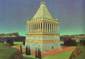 据说,哈利卡纳苏斯的摩索拉斯陵墓约45米高,底座上部呈阶梯形的金字塔状,卡里亚王国摩索拉斯国王的塑像可能矗立在顶端。陵墓毁于公元三世纪的一次地震中。