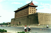西安城墙 陕西省西安市城墙是明朝洪武三年到洪武十一年(公元1370----1378年),在唐代和元代城墙基础上扩建的。平面呈长方形,周长11.9公里,高12米,顶宽12----14米。城墙外有宽20米、深10米的护城河。墙面用青砖包砌,厚重坚实,东西南北四面均开设城门。城门上建有城楼、箭楼、闸楼、巍峨凌空,气势宏伟。城楼与箭楼之间有瓮城。城四角各有一座角楼。这是我国现存唯一完整的古代大型城垣,现已将城墙辟为环城公园。