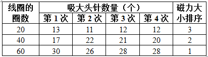 我们的发现:电磁铁磁力大小与线圈圈数有关。线圈圈数少,磁力小;线圈圈数多,磁力大。